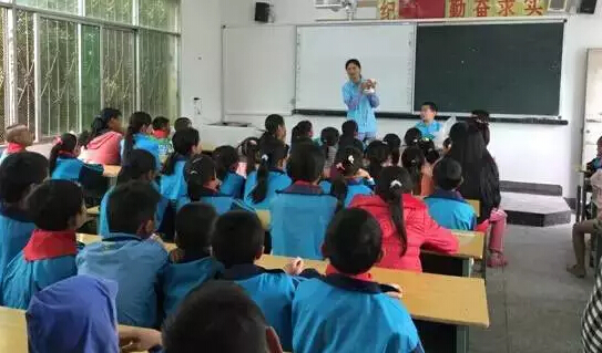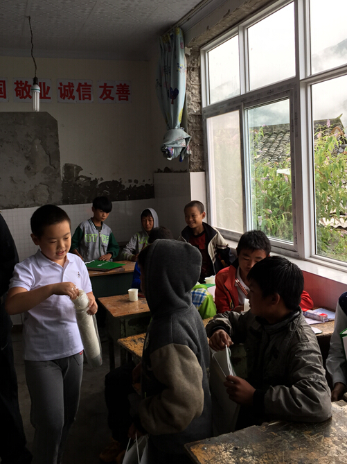 當地小學校環境艱苦,桌椅陳舊,牽動著每個人的心,志愿者為當地小朋友分發用品